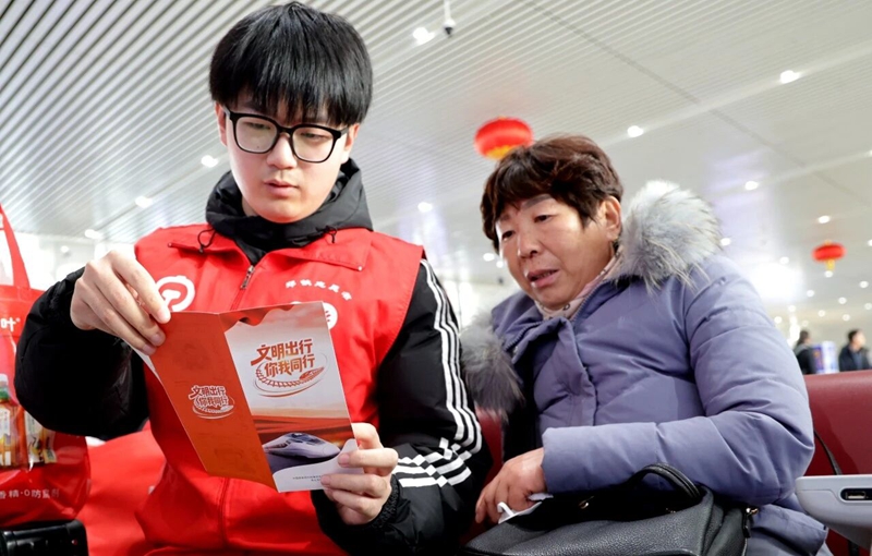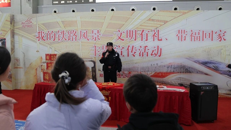 2月2日,商丘火车站在商丘站高铁二楼候车室开展“我的铁路风景——文明有礼、带福回家”主题宣传活动,为春运首日增添温情。