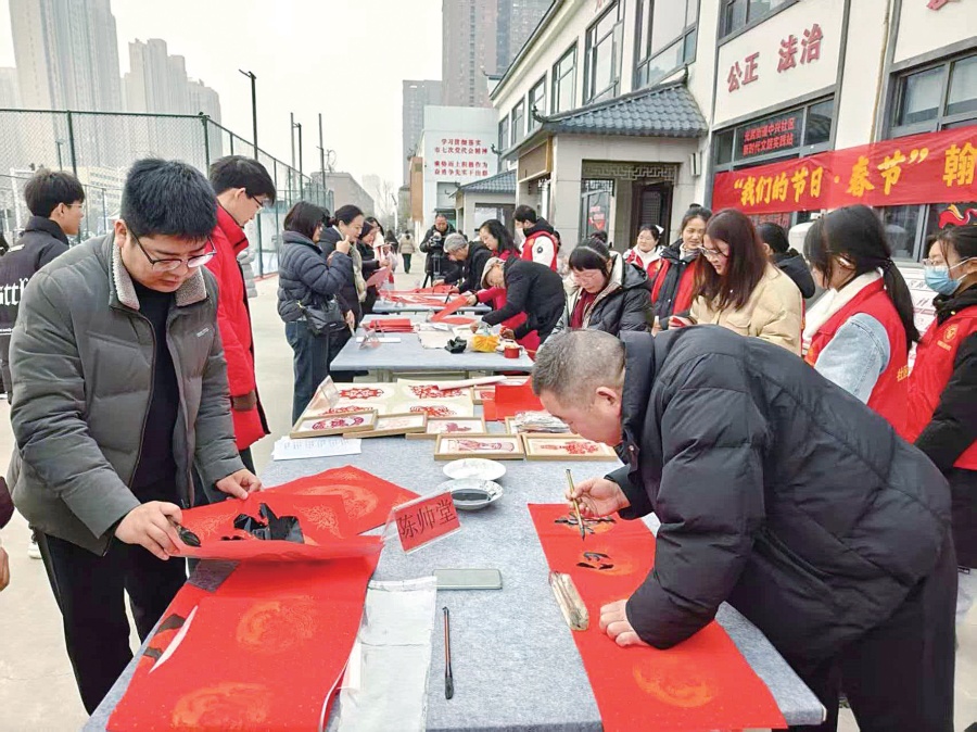 红纸铺展,墨香四溢,笔锋流转间,一个个“福”字跃然纸上,一副副春联墨迹未干便被群众捧在手中,脸上洋溢着幸福的笑容。