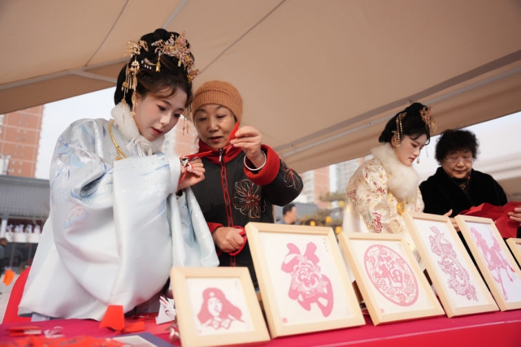 文明市集以烟火气聚拢人气,以文明风浸润人心,着力挖掘与活化洛阳优秀传统文化中的文明基因,让市民在沉浸式体验中感受传统文化的魅力,自觉践行文明新风。在非遗剪纸、非遗糖塑等非遗展示区,非遗传承人通过非遗作品的展示与义卖,传承和推广非物质文化遗产;在爱心助农区域,公益团队、周边商户展示具有洛阳特色的年夜饭等特色小吃,供市民免费品尝,在营造浓厚“年味儿”氛围的同时,汇聚社会爱心,传递社会正能量;“新年寄语”互动区,市民在寄语卡片上书写对新一年的祝福、期盼或文明承诺,让真挚心愿与文明风尚伴随祝福传递,共添节日温情;在银行送福区,工作人员宣传金融知识,守护居民“钱袋子”。此外,还有50名书法家受邀为市民写春联、送福字,借助春联传递喜庆与文明,送上新年美好祝福。