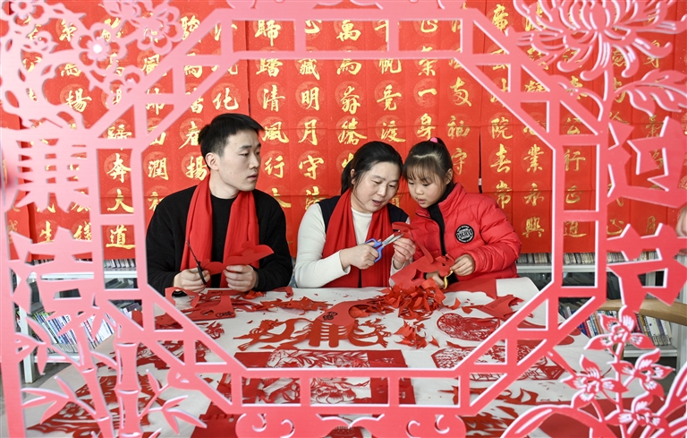 2月12日,在南阳市卧龙区陆营镇陆营村委文化活动室,南阳市非遗剪纸项目代表性传承人吕登阁给居民讲解剪纸技艺。