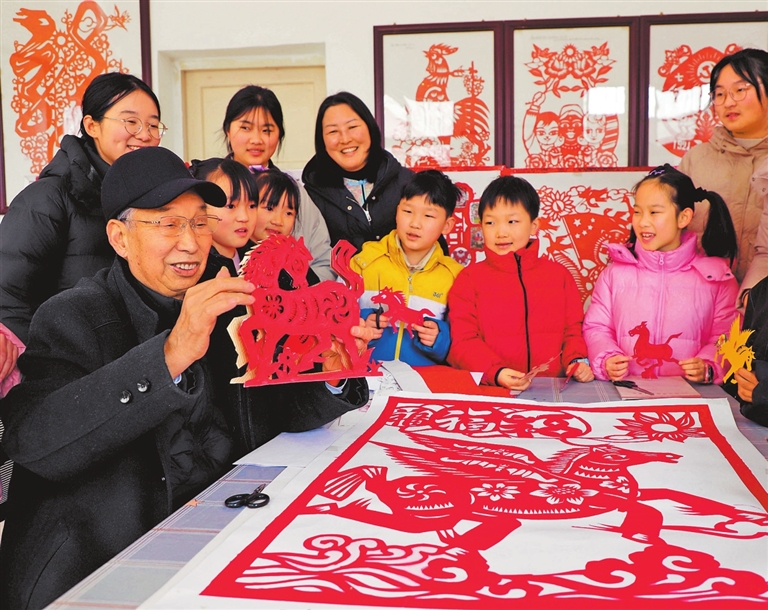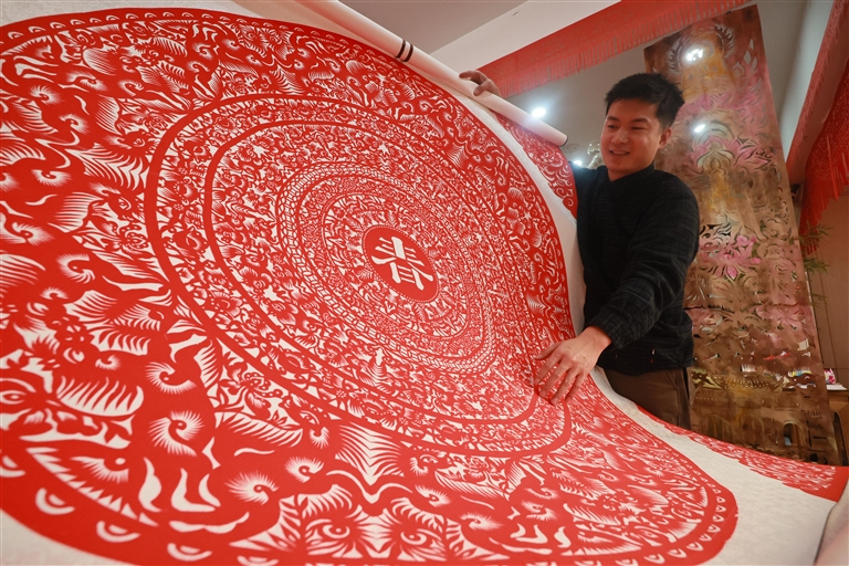 2月6日,河南省级非遗项目孟津剪纸代表性传承人畅杨杨展示他的剪纸作品“百马送财”。