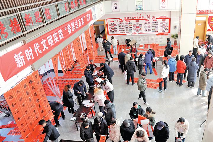 2月7日,济源市新时代文明实践中心,文艺工作者在义写春联。 春节临近,年味渐浓。济源市新时代文明实践中心举办年货大集、写福字春联等活动,迎接新春。