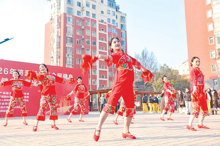 2月8日,济水苑小区,参赛队伍倾情表演。当日,“中国体育彩票”2026年济源示范区全民健身大拜年广场健身操舞比赛开赛。