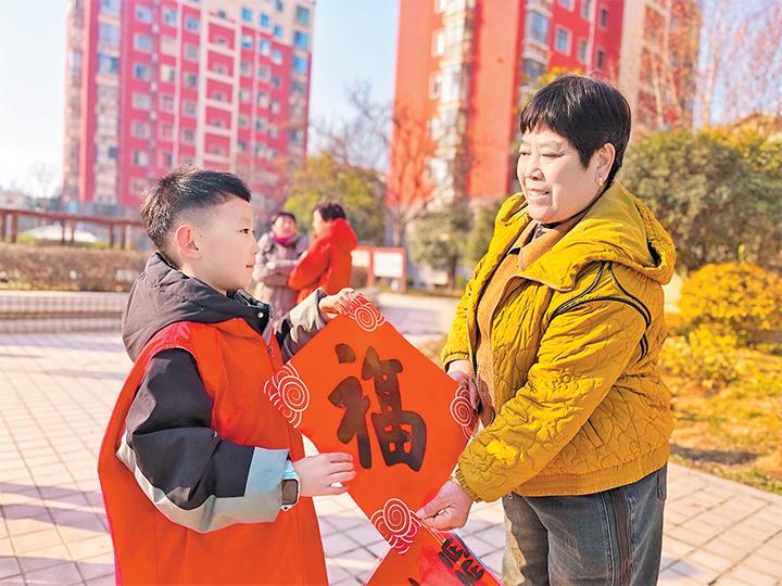 2月8日,小学生将“福”字送给社区居民。当日,黄河路小学组织开展新春送福实践活动。