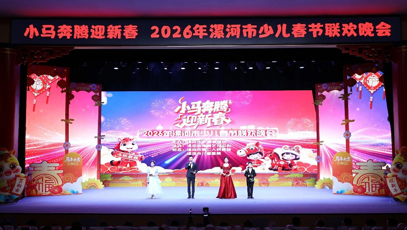 “小马奔腾迎新春”2026年漯河市少儿春节联欢晚会在市豫剧艺术中心精彩上演 。晚会在歌舞《小马迎春》的欢快旋律中拉开帷幕,相声、朗诵、合唱、舞蹈等节目轮番登场、精彩纷呈,现场气氛热烈,掌声不断。