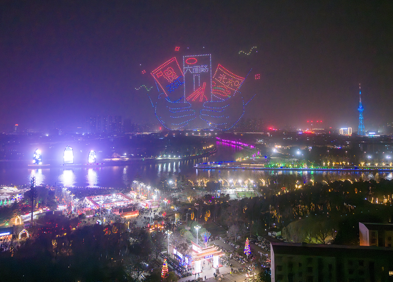 千机飞“只有漯河”春节展演活动陆续在舞阳县盐都公园、银滩乐园、红枫广场等处精彩上演,活动以天为幕、以城为景,聚焦现代化漯河“三城”建设发展成就与“四大本土文化”厚重历史,通过科技、文化、创意的深度融合,让传统年味变得更浓且富有时代感,展现了我市在现代化进程中的独特风采与无限活力。