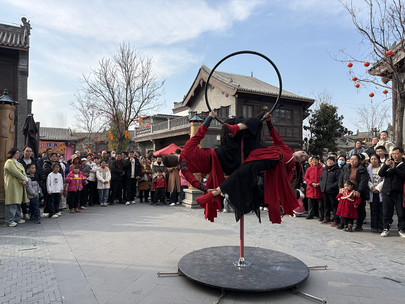 漯湾古镇年味大集人气爆棚,处处洋溢着温馨欢乐的节日气息。经典豫剧《秦香莲》在这里上演;沉浸式民俗演艺精彩纷呈;杂技表演轮番登场,惊险刺激的技艺展示赢得观众阵阵掌声;在倾城一秀剧场,货郎造型演员带来的相声表演诙谐幽默、贴近生活,引得现场观众笑声不断;花船巡游古韵十足,为古镇增添了别样的水乡风情。