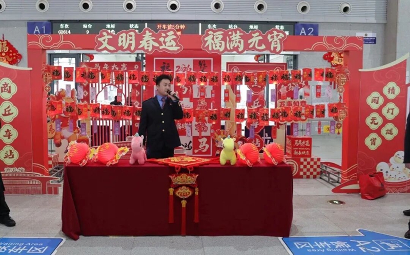 3月2日,在元宵节来临之际,商丘高铁站候车室洋溢着节日的欢乐与温馨。上午10时,“文明春运 福满元宵”主题活动正式开启,活动采用猜灯谜、送元宵、赠祝福卡、文明宣传等形式,为候车旅客送上节日祝福,全力营造温馨有序的出行环境,让归途充满温情与文明。