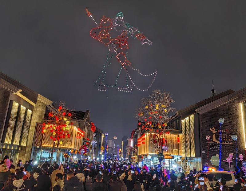 20时50分,500架无人机缓缓升空,瞬间点亮夜幕。点点星光迅速集结、有序变换,引得现场观众阵阵欢呼。光影流转间,无人机编队接连变换造型,尽显周口特色与文化底蕴。龙马造型凌空呈现,寓意吉祥如意、马到成功;“三鱼同首”图案缓缓浮现,这一源自关帝庙旗杆底座的经典纹饰,承载着周口人民对和谐美满的美好祈愿;帆船破浪前行,宝鼎沉稳矗立,关公圣像凛然伫立,每一个造型都精准还原、惟妙惟肖。当“万家灯火侔江浦,千帆云集似汉皋”的经典诗句闪耀夜空时,现场掌声雷动,千年漕运文化的厚重底蕴扑面而来。