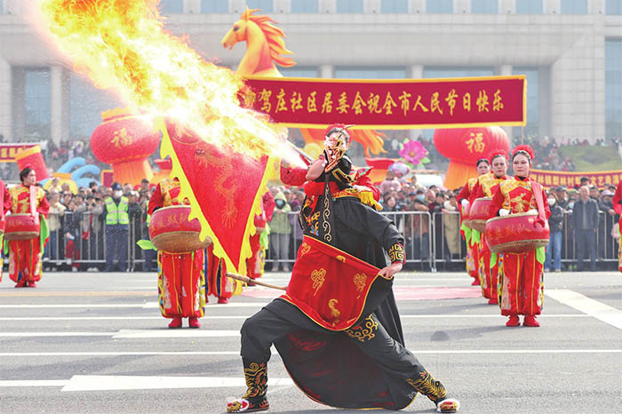 “背桩”“小鬼摔跤”等济源非物质文化遗产项目在本次汇演中非常吸睛,将马年“跃马新程”的美好愿景与传统技艺完美融合。济水街道南街社区居委会的“背桩”《马跃新程桩舞欢》中,孩子们在桩上身姿轻盈、灵动朝气。五龙口镇马村表演的《舞龙与小鬼打架》生动活泼、韵味十足。节目中,打鼓的李元生、打镲的李一亮今年都70多岁了,他们与其他几个老伙计为舞龙奏乐。“我们搭档已经10余年了,年年都来市里表演,把声势造起来,把龙的气势舞出来,感觉有使不完的劲!”李元生说。