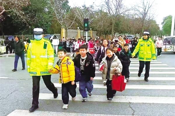 民辅警护送学生过马路。