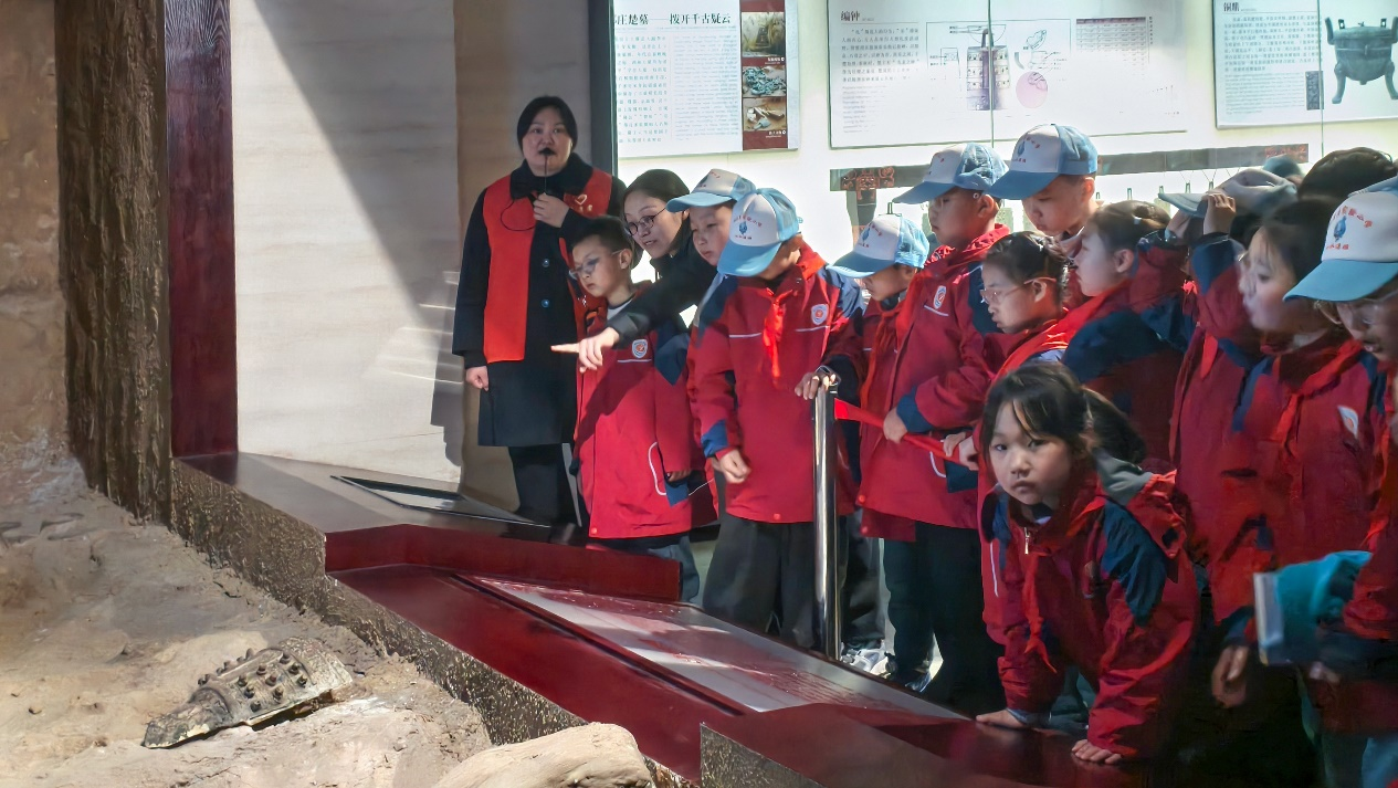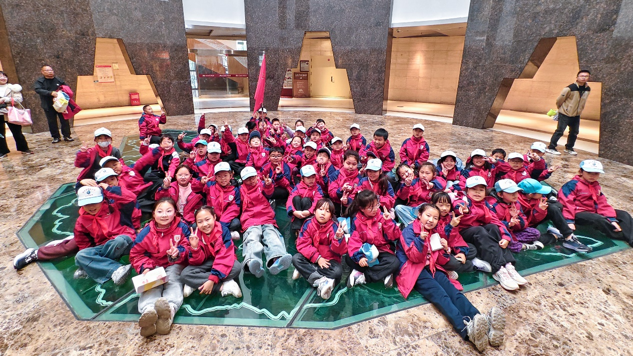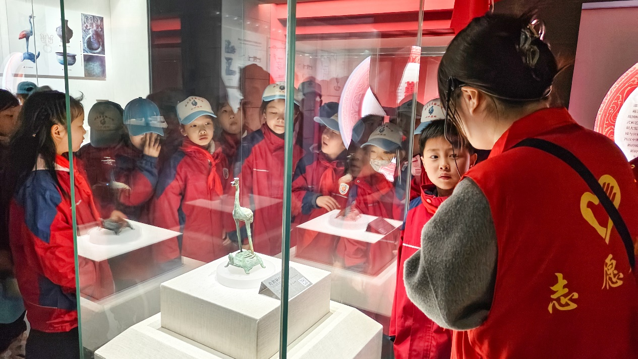 劳动结束后,师生们有序步行至驻马店博物馆。进入馆内,同学们立刻被庄重宁静的氛围所感染。在讲解员的引领下,他们文明观展、认真聆听。在青铜鸟雕塑展柜前,孩子们围拢在一起,透过玻璃仔细观察文物的每一处细节,眼中充满好奇;在历史展墙边,大家跟随志愿者的讲解,凝神静听,仿佛穿越时空,触摸家乡的历史脉动。一件件珍贵的文物、一幅幅生动的画卷,让孩子们深刻感受到脚下这片土地的深厚底蕴。