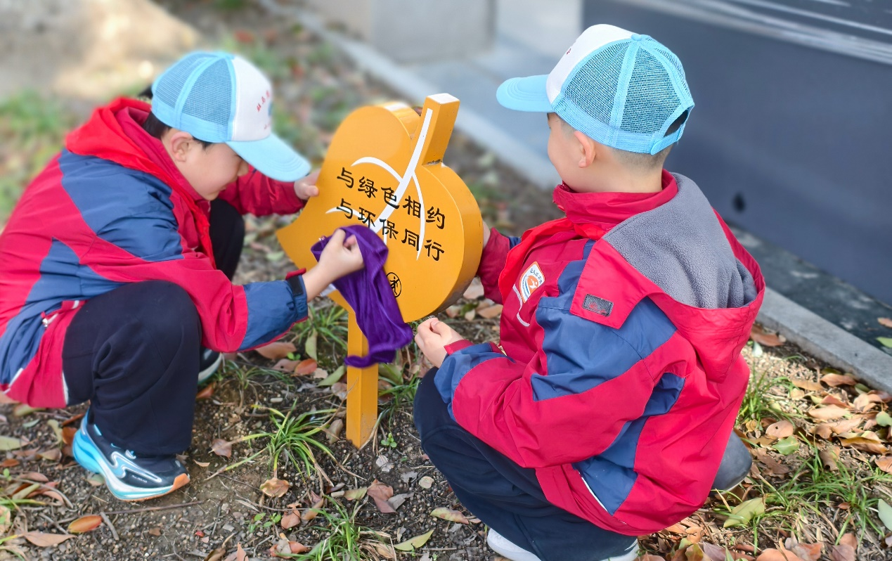 活动当天,同学们身穿整齐的校服,精神饱满。在清洁家园环节,孩子们手持清洁工具,投入到劳动中。他们三五成群,分工协作:有的细心捡拾绿化带中的纸屑、塑料袋,有的认真擦拭公共设施。在校园附近的一处绿地旁,两名同学正蹲在地上,仔细擦洗一块写着“与绿色相约 与环保同行”的标识牌。另一处,一名女生正用垃圾夹小心翼翼地从花坛中夹起杂物,神情专注。孩子们不怕脏、不怕累,身影在春日阳光下跃动,成为亮丽的风景。