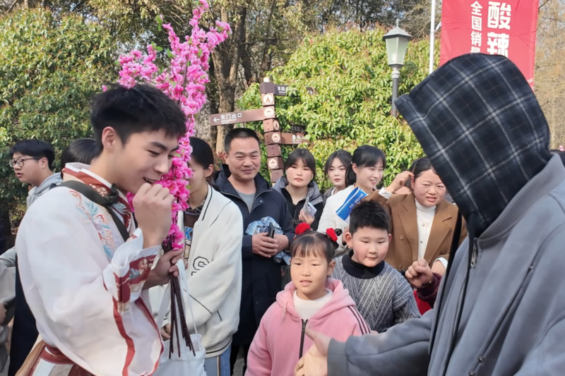活动最大的亮点在于“沉浸式”与“文化味”的深度融合。景区内,息侯、息夫人、苏轼等历史人物NPC“穿越”而来,与游客对诗、互动,获胜者可赢取“银票”兑换礼品,让游客在欢声笑语中感受千年古县的人文底蕴。杉林步道上,系满桃花诗词的丝带随风摇曳;桃花心愿墙前,人们郑重写下美好祝福。