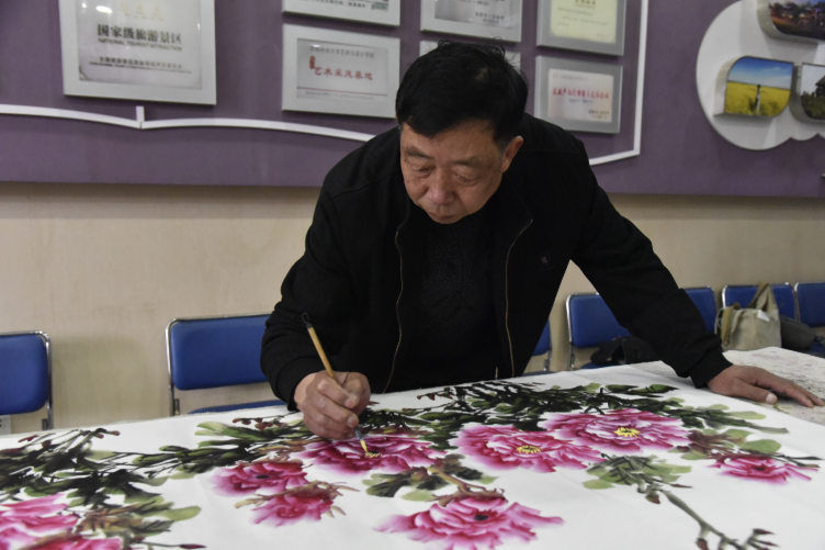 像他们这样从培训中受益的画师还有很多,郭亚修也是其中之一。十四五岁就跟着初中美术老师郭泰安学画的他,后来带着作品到北京、石家庄等地闯市场,积累了丰富的创作经验,2009年便返乡担任牡丹画教师。“画画早已成为我生命的一部分。”郭亚修说。