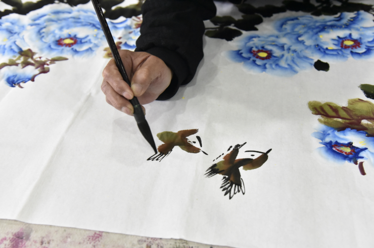 几名画师正埋首作画,笔墨点染间,一朵朵娇艳的牡丹绽放在宣纸之上。点上花芯,再添两只可爱的麻雀,画面顿时有了生机与意趣。