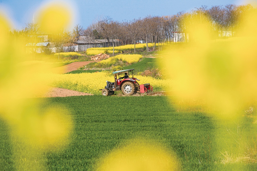 春暖唐河,农机穿梭花海麦田,村民抢抓农时忙春耕。通讯员 王有庆 摄