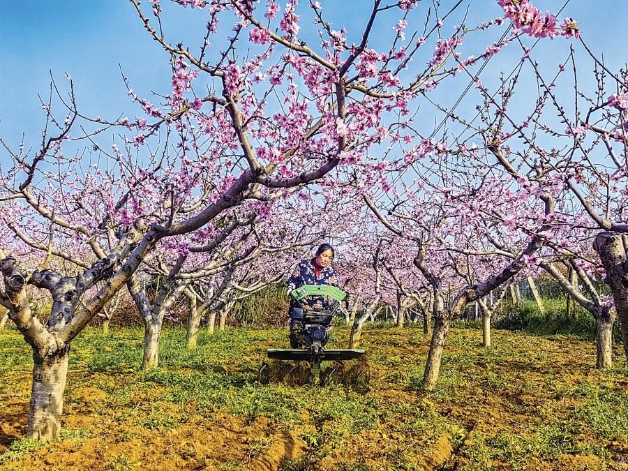 南召县太山庙乡兴隆村千亩桃园繁花满枝,果农花间除草。