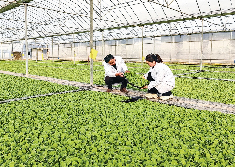 社旗县苗店镇智能育苗大棚内,工作人员察看种苗长势。