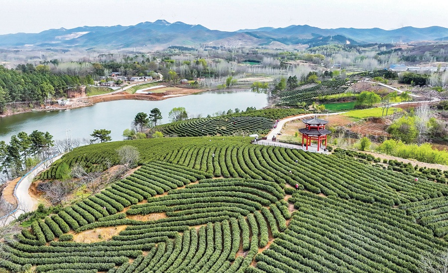 桐柏县安棚镇茶园层峦叠翠,茶农趁晴采摘明前茶。