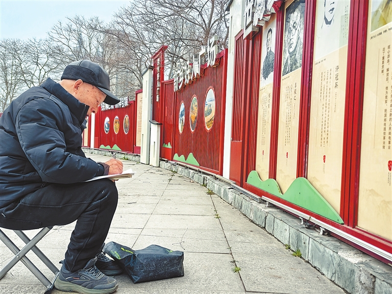 董振玉在新乡市牧野湖畔的好人广场抄写新乡名人、英烈事迹,为制作宣传展板积累素材。