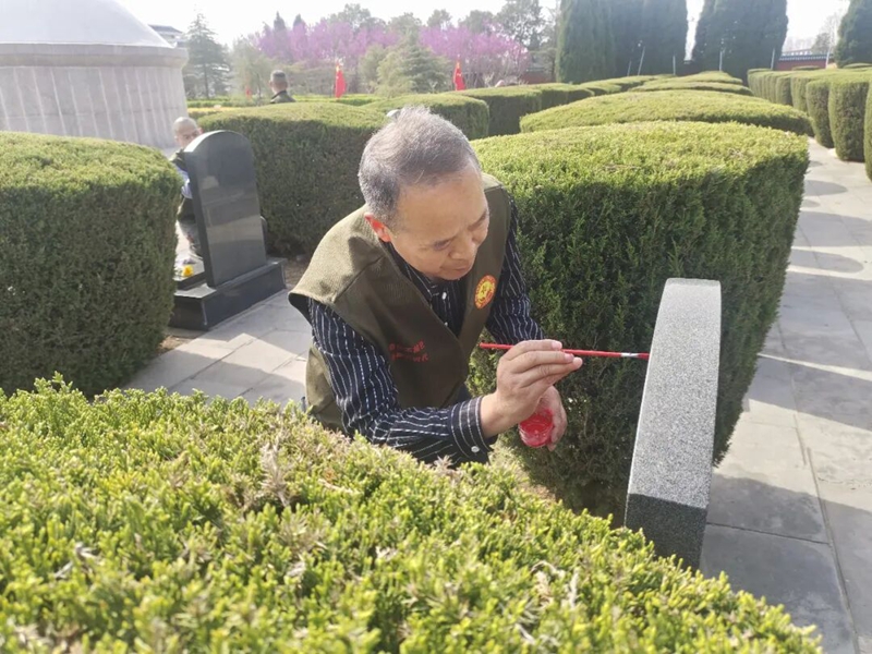 没有流于形式的仪式,唯有发自内心的虔诚。现场,志愿者拿起抹布、蘸好红漆,奔赴每一座烈士墓碑,开启清扫与描红工作。他们俯身细细擦去碑身的岁月尘埃,再一笔一划精心描红碑文与五角星,指尖拂过的是冰冷的石碑,心中涌动的是滚烫的敬意。每一个动作都轻柔细致,生怕打扰了长眠的英魂;每一笔红漆都浓淡相宜,勾勒出不朽的英雄印记。