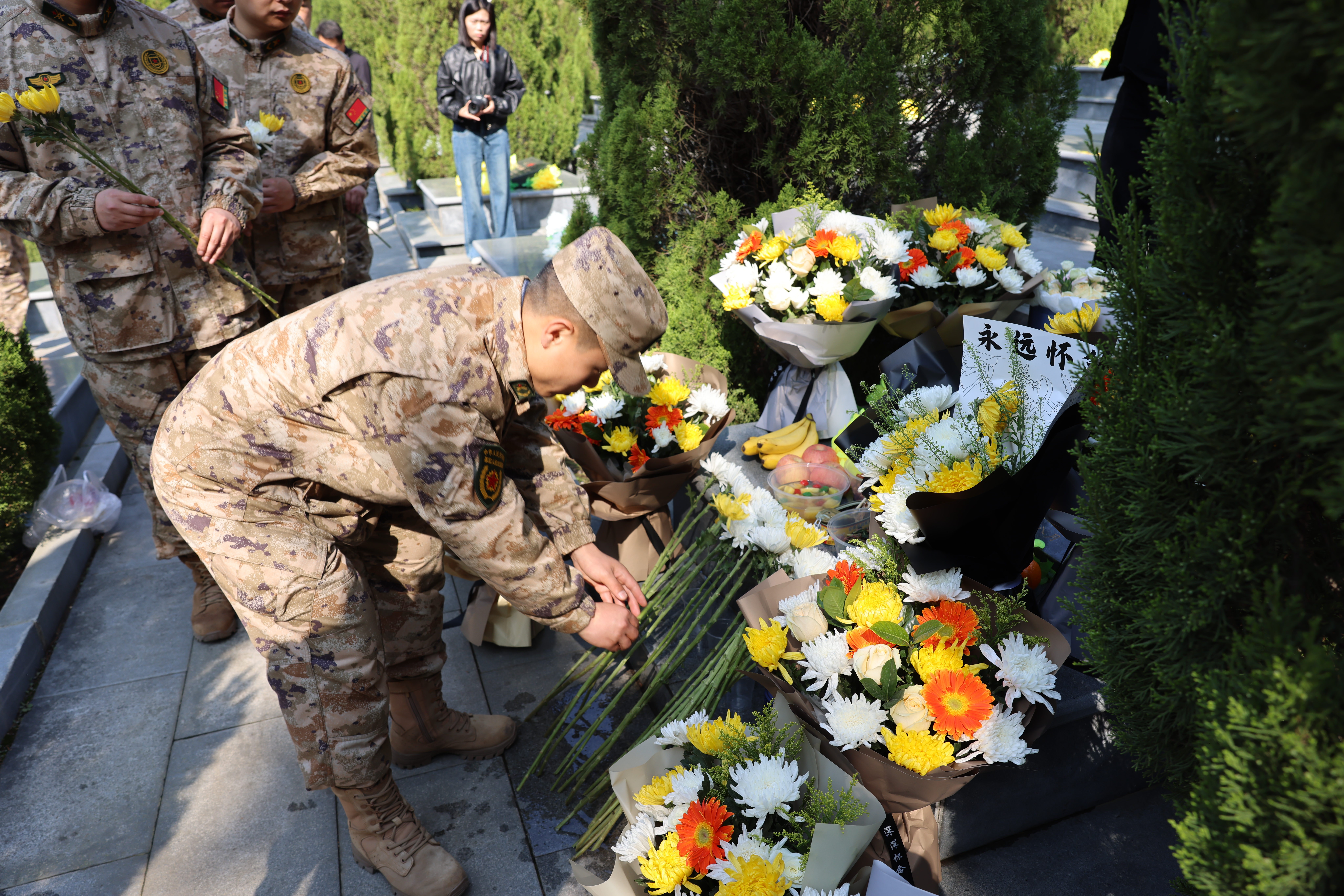 在确山县竹沟革命烈士陵园,确山县人武部官兵向周昆训烈士献花。 (张程皓/摄) 周昆训烈士系驻马店市确山县人,生前担任吉林省舒兰市人民武装部政治委员。2023年8月,舒兰市遭遇极端强降雨引发特大洪涝灾害,危急时刻,周昆训挺身而出、冲锋在前,义无反顾奔赴抗洪抢险一线,用生命守护人民群众生命财产安全,不幸壮烈牺牲,后安葬于确山县竹沟革命烈士陵园,以赤诚丹心践行了军人的使命担当。 松柏苍翠寄哀思,丰碑矗立映初心。在确山县竹沟革命烈士陵园内,确山县人武部全体官兵、文职人员、专武干部、民兵代表,以及当地党政机关干部群众身姿挺拔、列队整齐,神情庄重肃穆。伴随着低沉的旋律,官兵们缓步上前,向周昆训烈士墓碑郑重敬献花篮,细心整理花篮缎带,全体人员集体脱帽、低头默哀,并行三鞠躬礼,以最庄严的军人礼仪,深切缅怀这位从家乡走出、以生命赴使命的英雄战士,寄托对烈士的无限追思与崇高敬意。当日,周昆训烈士的家属也来到确山县竹沟革命烈士陵园祭扫英烈。仪式结束后,大家缓步绕行墓碑,轻轻擦拭碑身、敬献鲜花,重温周昆训烈士“吾将吾身献吾党”的铮铮誓言,深刻感悟他对党忠诚、信念坚定,心系人民、无私奉献,向险而行、舍生忘死的崇高精神品格,接受了一场深刻的红色精神洗礼。