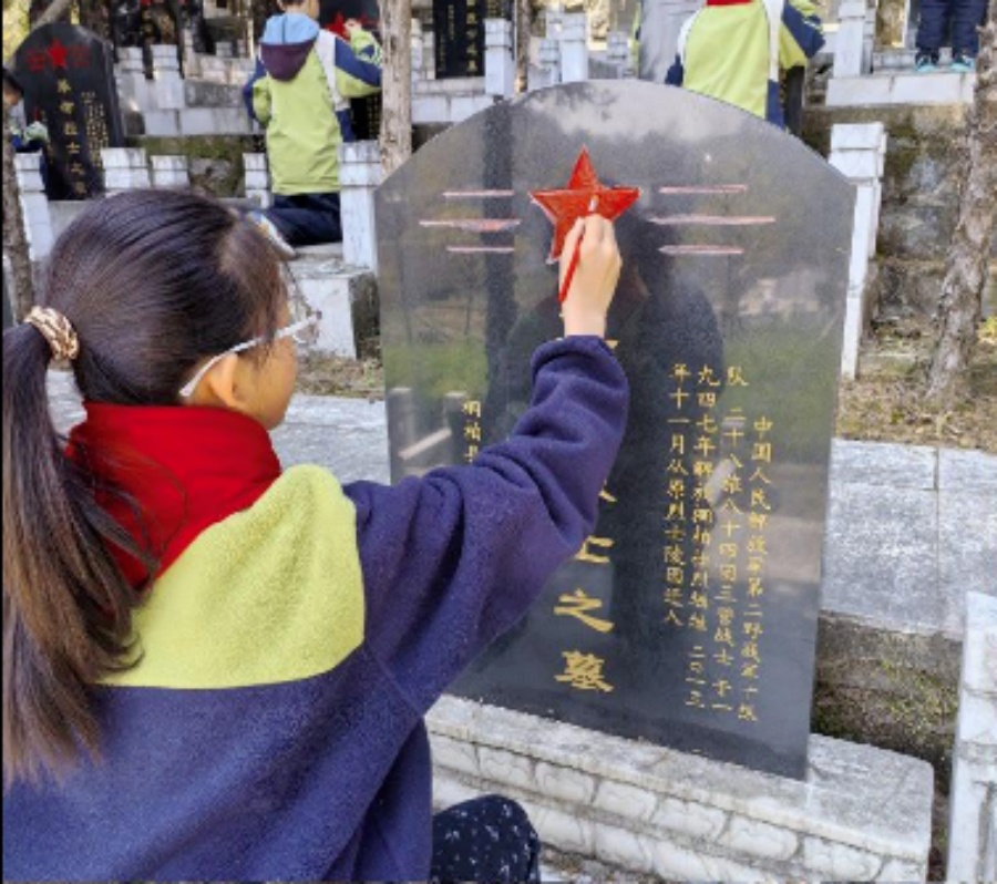 在烈士陵园,全体师生齐声高唱《义勇军进行曲》,少先队员代表学校向革命烈士敬献花篮。仪式结束后,全体学生手持洁白小花,有序来到纪念碑前庄重鞠躬、敬献白花,以朴素方式寄托绵绵哀思。随后,同学们纷纷走近烈士墓碑,认真擦拭碑身尘埃,一笔一画为墓碑描红。每一下擦拭都寄托对先烈的哀思,每一笔描红都饱含着对先烈的崇敬,他们誓用实际行动让英雄的名字永远鲜亮,让红色精神代代相传。