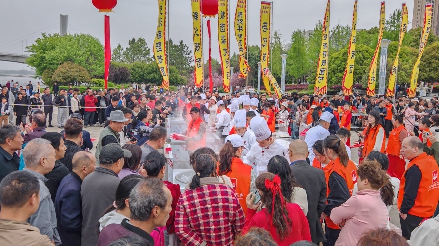 4月6日,新野县白河滩公园广场内人头攒动,热闹非凡,新野县商务局、新野县板面协会联合举办2026年“万人共品一碗面”大型美食文化活动,现场1.5万余名群众共品板面美味。